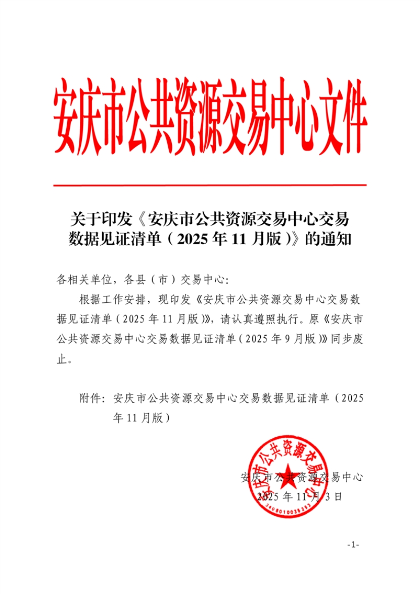 关于印发《安庆市公共资源交易中心交易数据见证清单(2025年11月版)》的通知